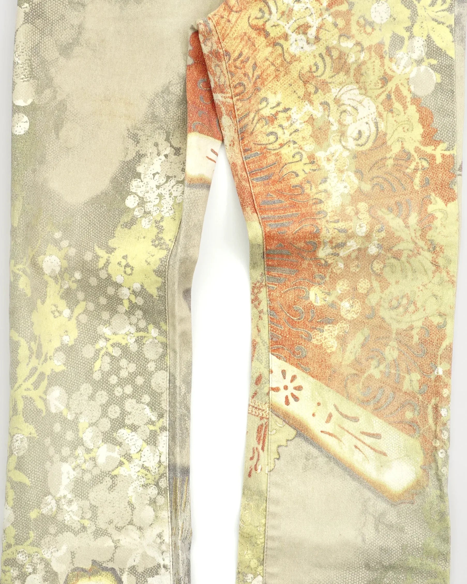 Product details: All-over oriental-inspired print with fans and florals, patchwork elements, hints of orange and green overlays, soft cotton, straight-leg cut, rear patch pocket.