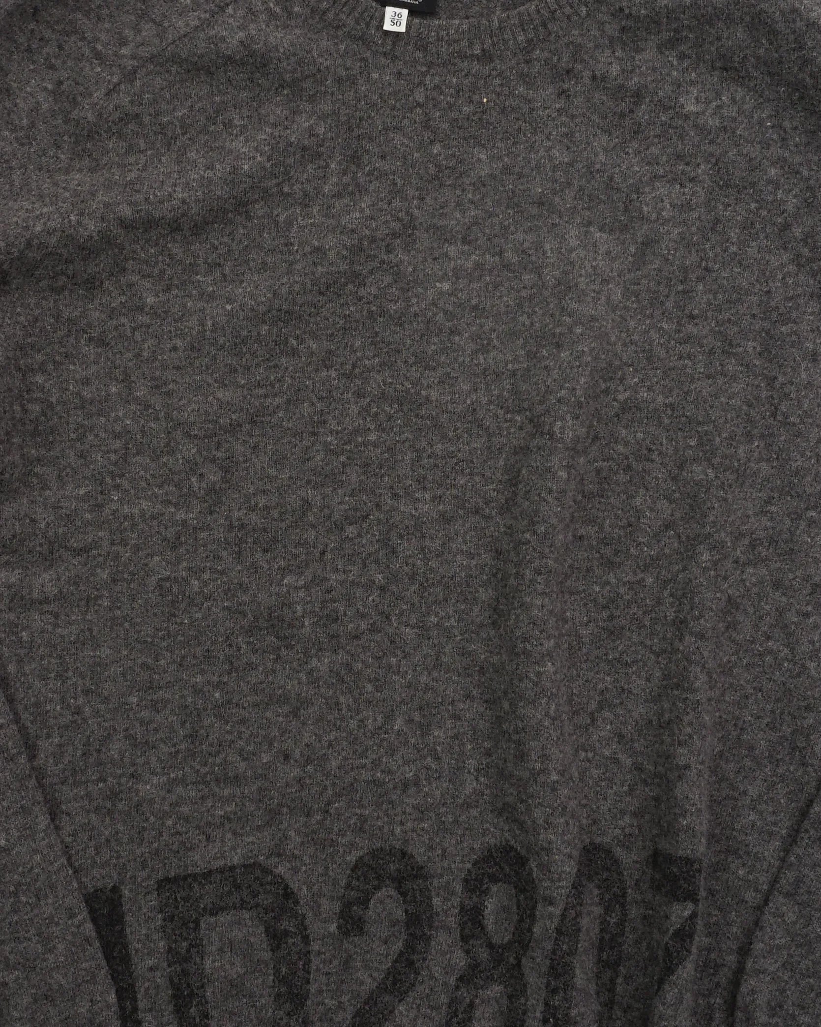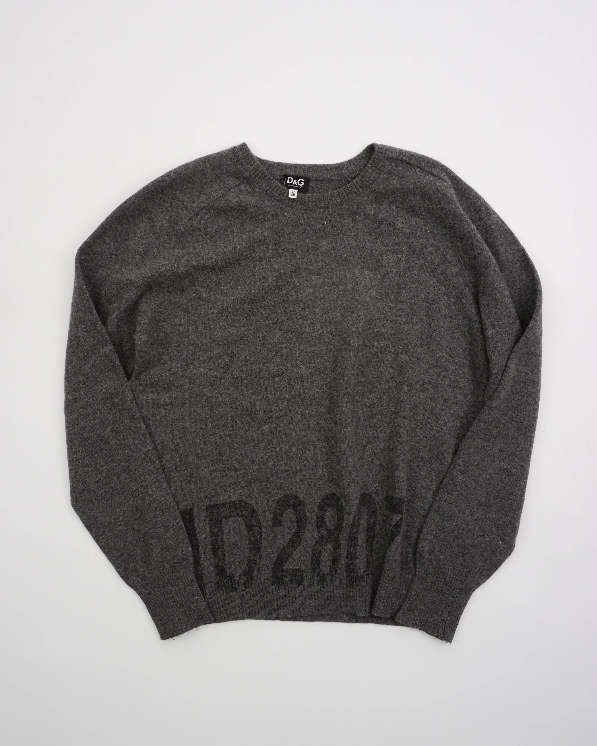 Product details: Gray crewneck sweater, tonal oversized graphics including 'D&G' and numeric prints, likely wool-blend, ribbed hem and cuffs.