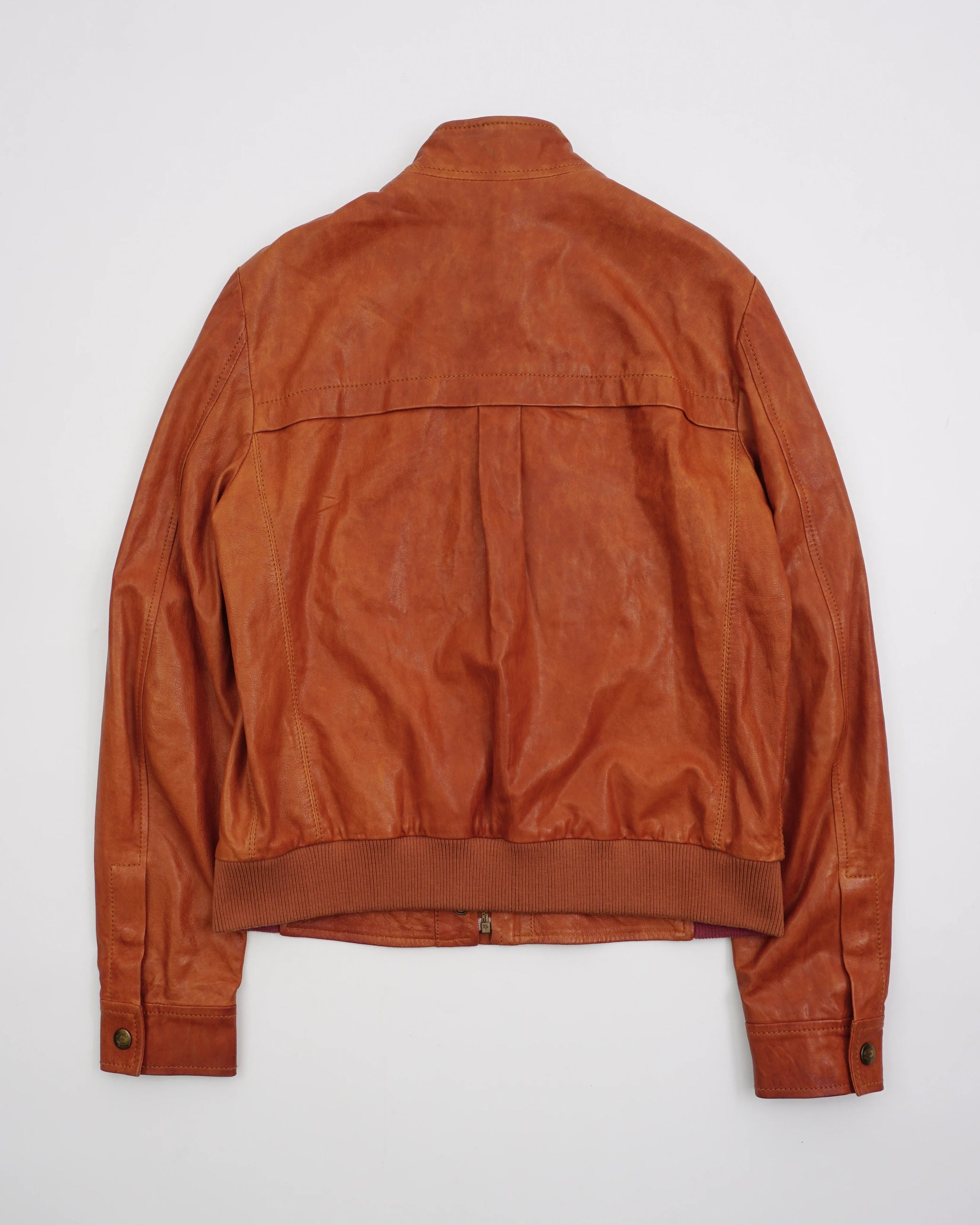 Product details: Brown leather, snap collar, ribbed hem and cuffs, minimalist design, structured fit, smooth finish.