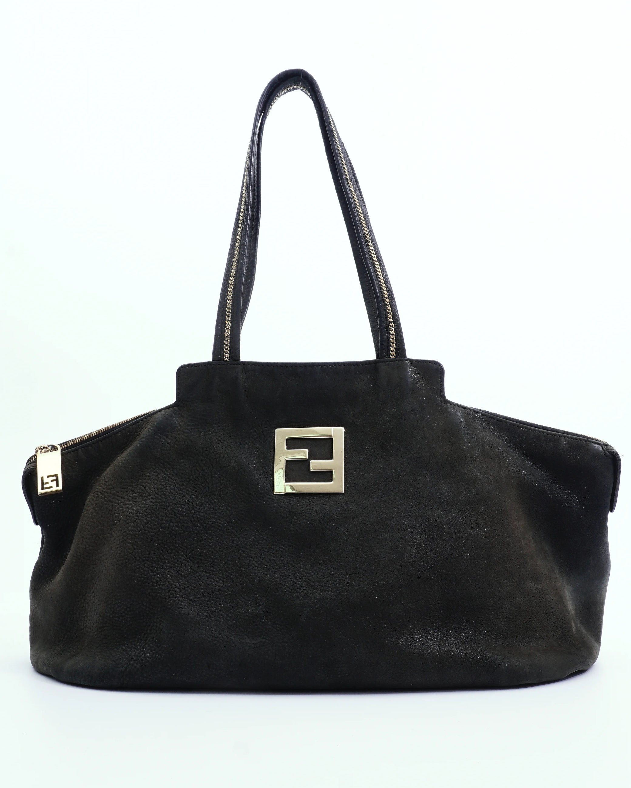 Product details: Black suede exterior, double top handles with visible zipper tape trim, oversized front FF logo plaque in gold-tone hardware, softly structured wide body, minimal seams, simple back with same handle construction.