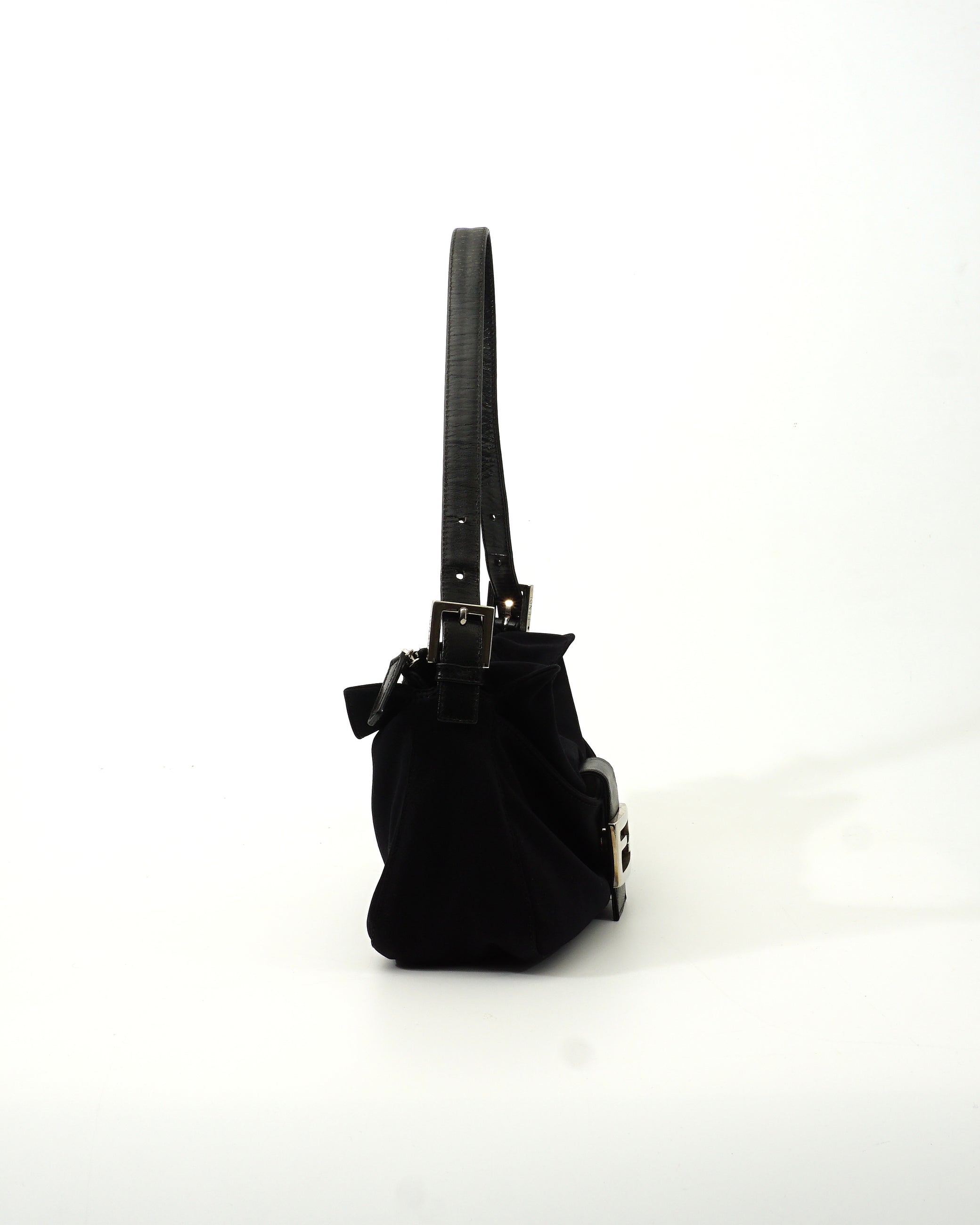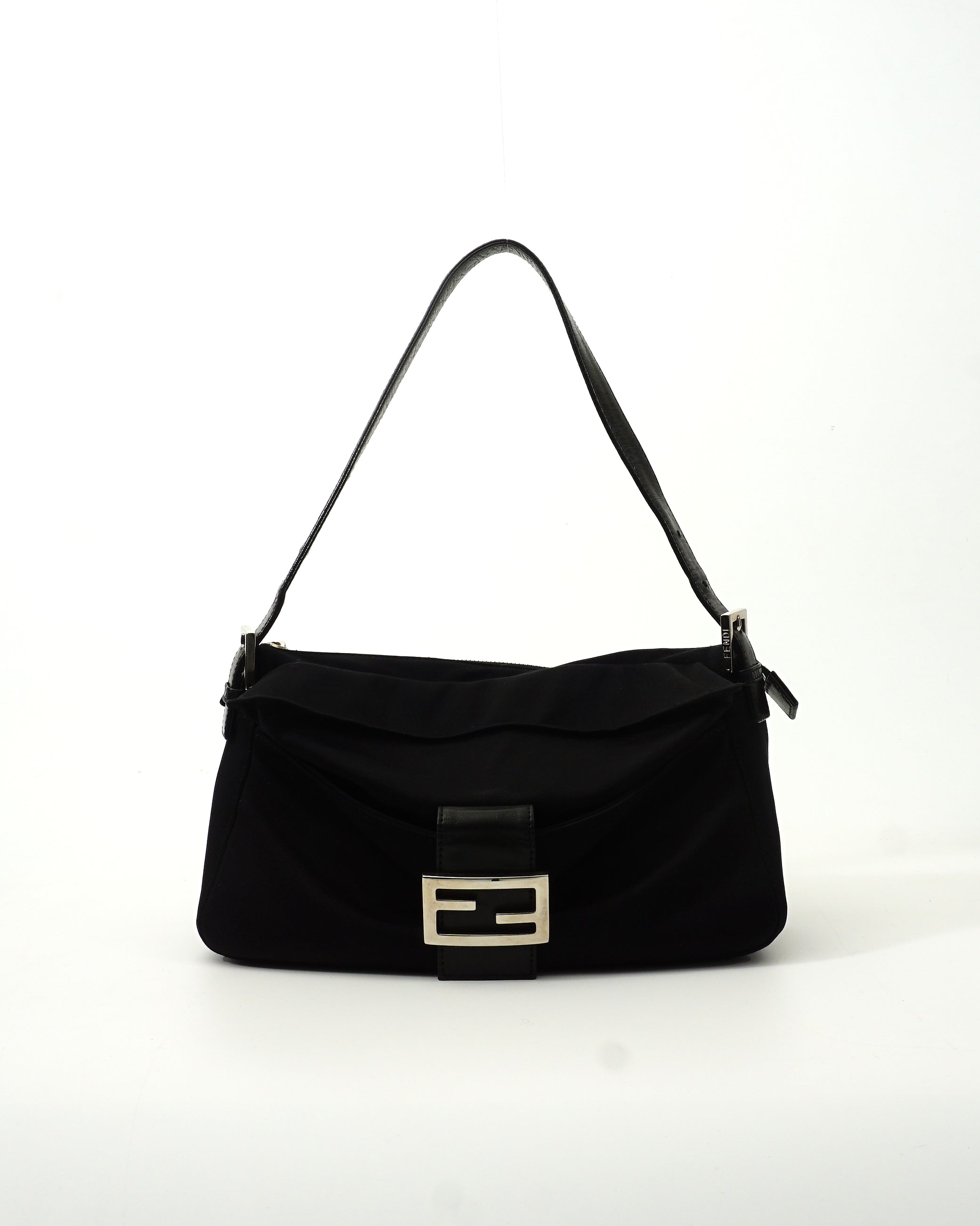 Product details: Two black designer handbags shown: (1) Fendi baguette-style shoulder bag in smooth black fabric with a wide leather strap and large silver-tone FF buckle clasp; top zip with leather pull.