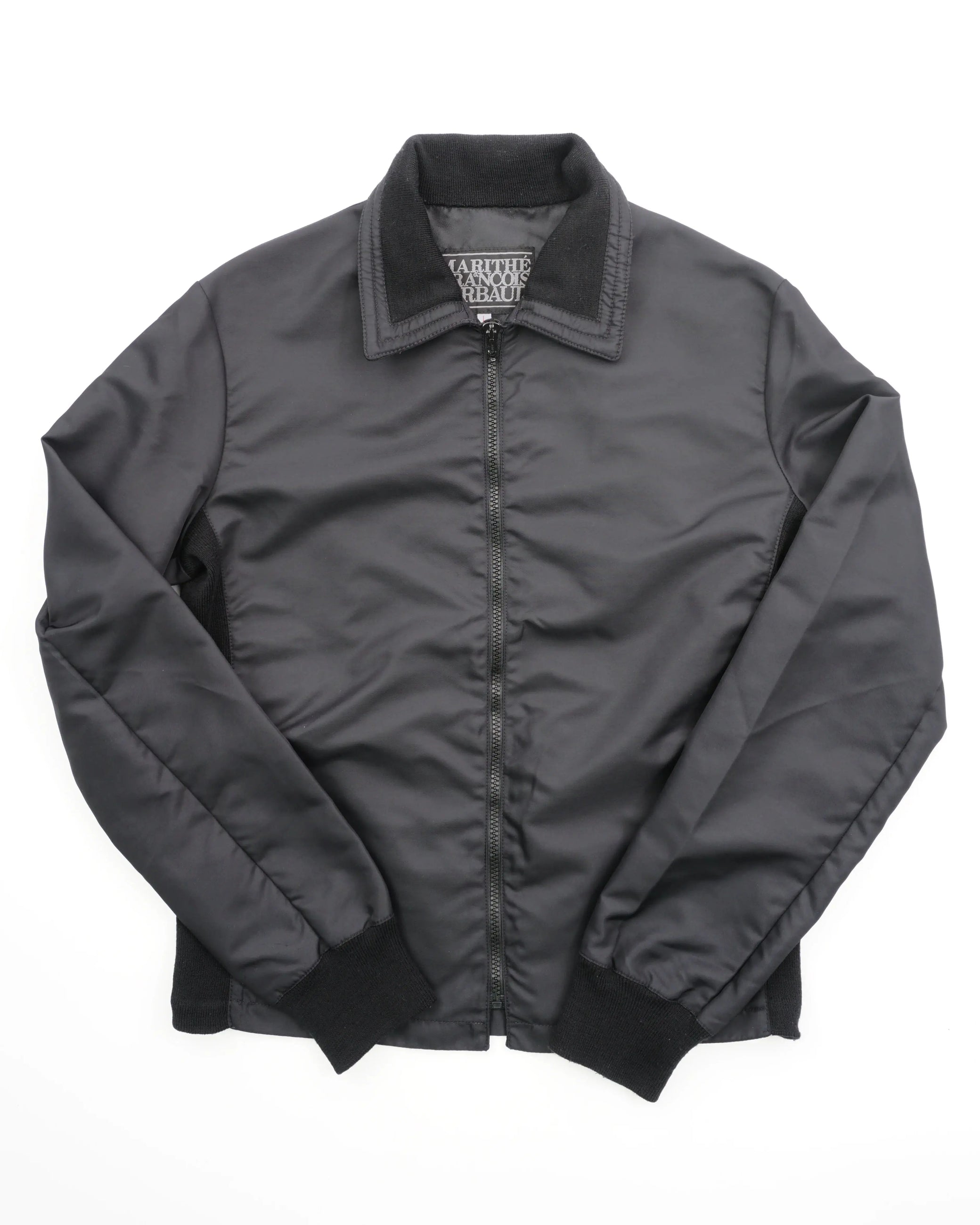 Product details: Black satin-finish fabric, rib-knit cuffs, zip front closure, classic collar, underarm/side panels for fit, minimalist design.