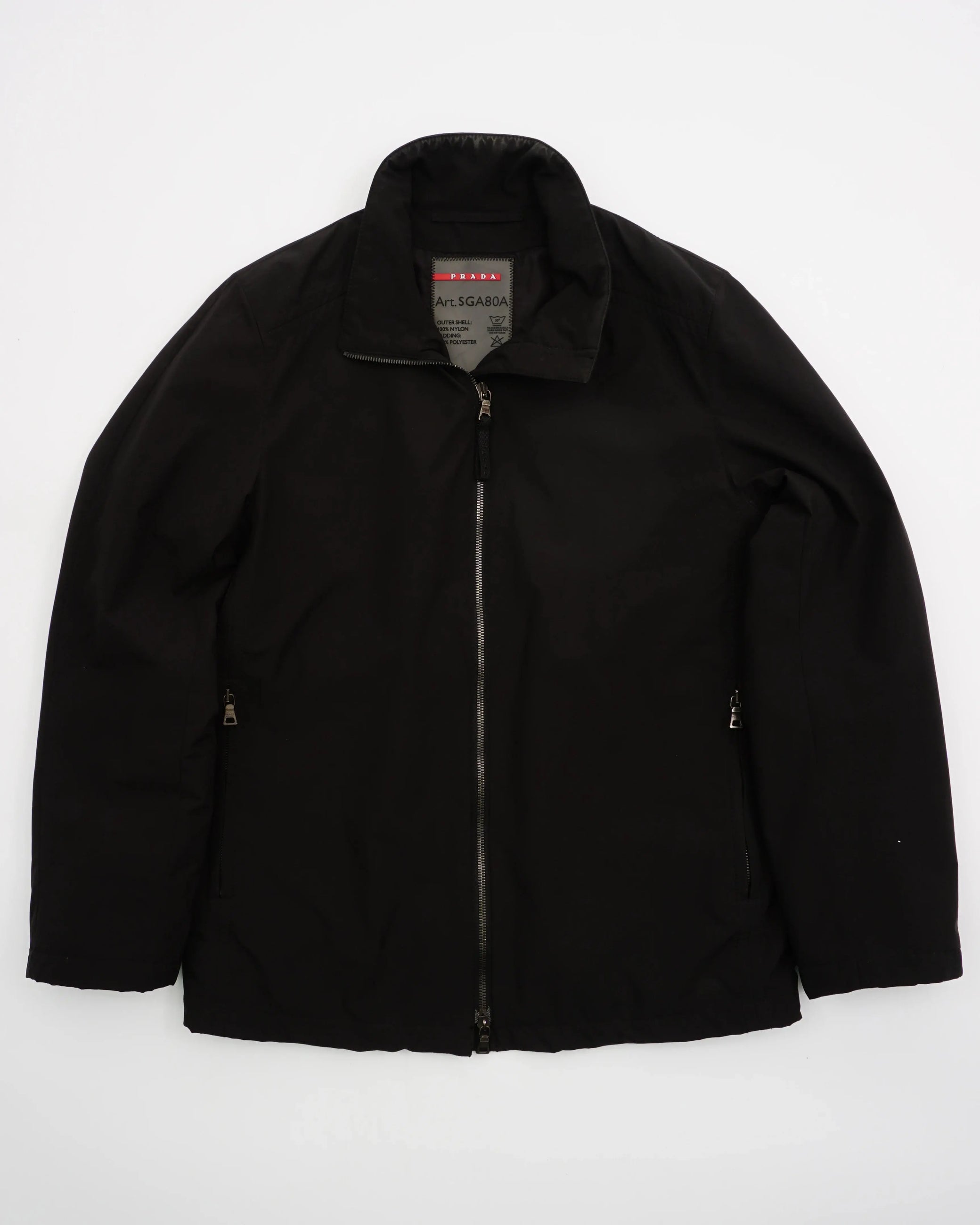 Product details: Black zip jacket, stand collar, front zipper, side zip pockets, adjustable back hem, red PRADA tab.